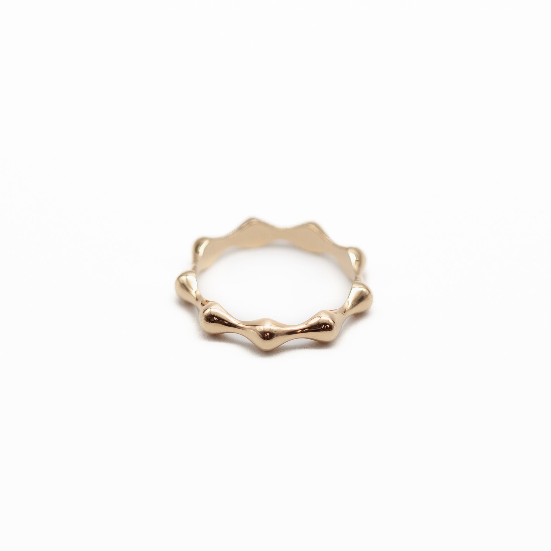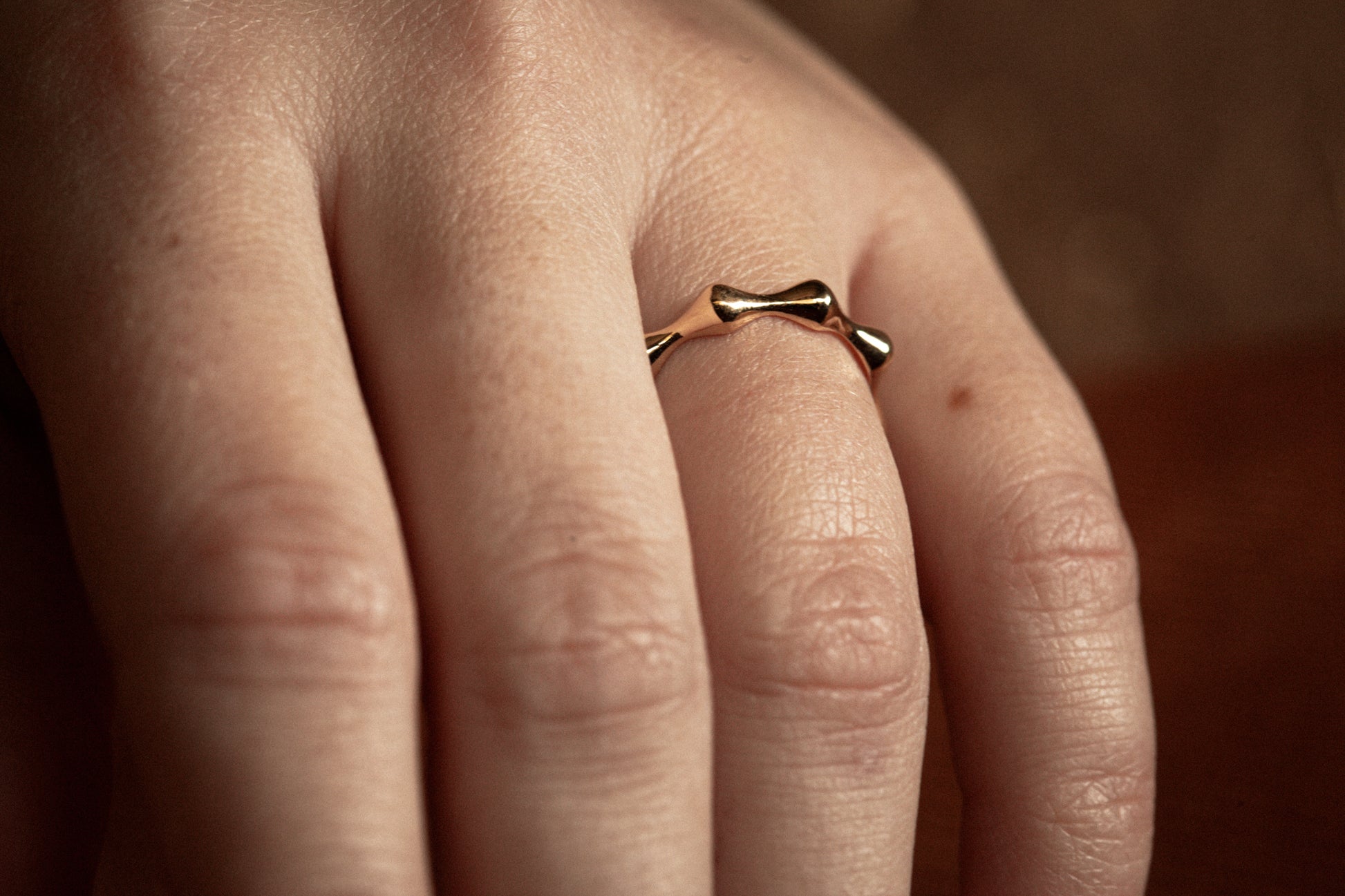 A gold wavy ring with shiny finish. Inspired by the motion of water and their flow