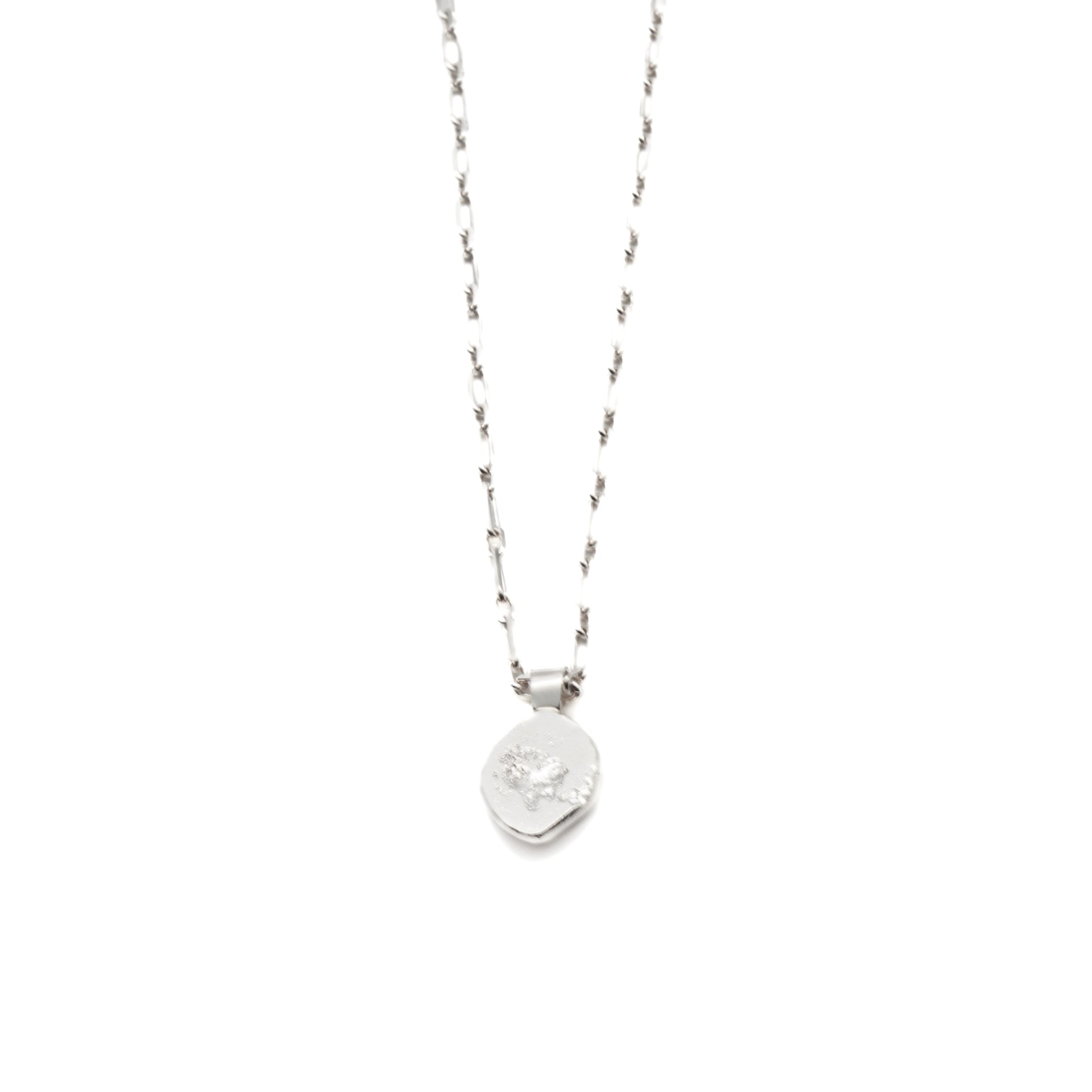 Smooth and sculpted silver medallion on an oval linked diamond cut chain.